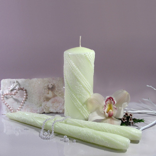 Набор свадебных свечей ручной работы для обряда "Семейный Очаг". Набор выполнен в нежном салатовом цвете с легким перламутровым блеском. Свечи украшены жемчугом и кружевом. Высота свечей - 140 мм и две по 245 мм. Диаметр 60 мм и 2 по 20 мм.
