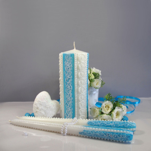 Набор свадебных свечей ручной работы для обряда "Семейный Очаг". Набор "Прованс" Тиффани выполнен в белом и нежно-голубом цвете. Свечи украшены жемчугом. Высота свечей - 150 мм и две по 245 мм. Диаметр 60 мм и 2 по 20 мм.