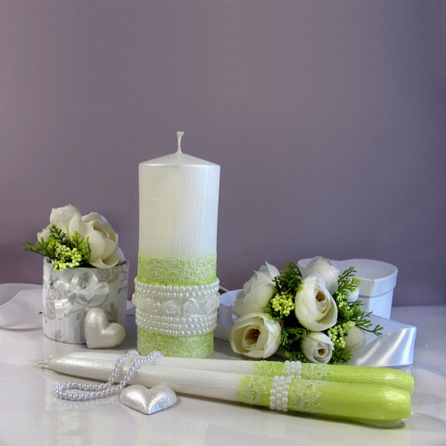 Набор свадебных свечей ручной работы для обряда "Семейный Очаг". Набор выполнен в белом и нежно-салатовом цвете с легким перламутровым блеском. Свечи украшены жемчугом и кружевом. Высота свечей - 150 мм и две по 245 мм. Диаметр 60 мм и 2 по 20 мм.