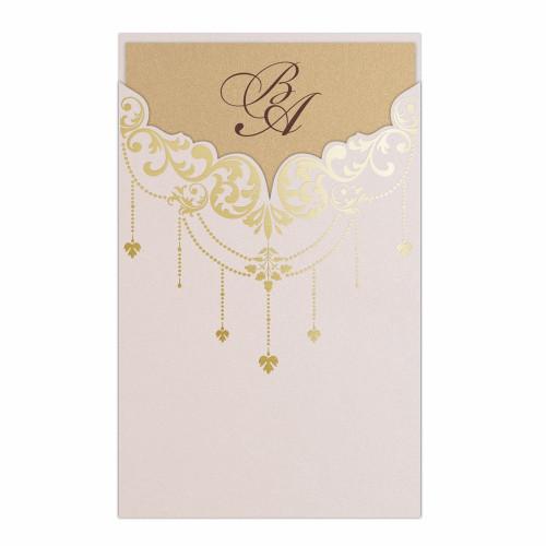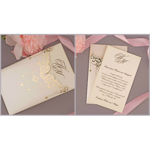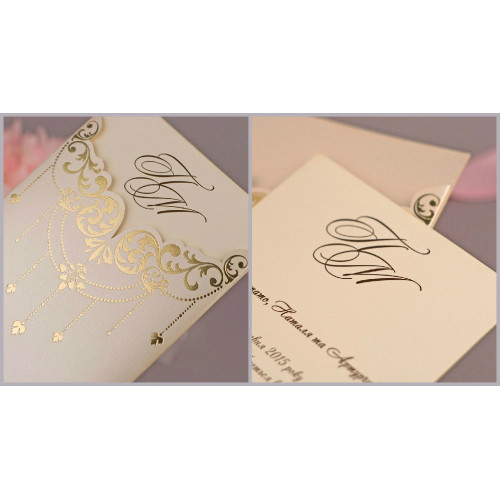 Нежное свадебное приглашение декорированное тиснением узора на обложке золотой фольгой.