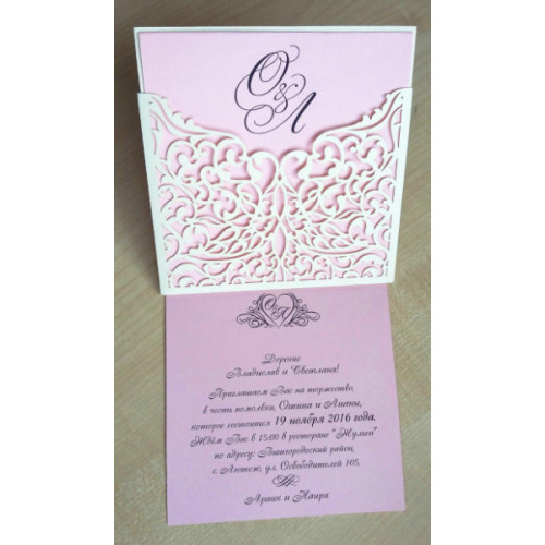Свадебное приглашение выполнено в формате конверта. Через ажурную высечку слегка просматривается вкладка, на которую наносятся инициалы молодых.