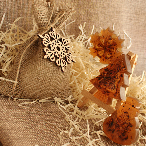 Новогодний набор мыла ручной работы состоит из трех фигурок - снежинки, елки и снеговика, весом по 50 г, в подарочном мешочеке из натуральной мешковины. Мешочек декорирован снежинкой высеченой лазером из фанеры. Мыло изготовлено из натуральной полупрозрачной основы, без применения красителей, с добавлением цветов лаванды и эфирных масел хвои, эвкалипта. Каждая фигурка из мыла герметично упакована в защитную пленку. Перед использованием мыла ручной работы необходимо снять пленку.