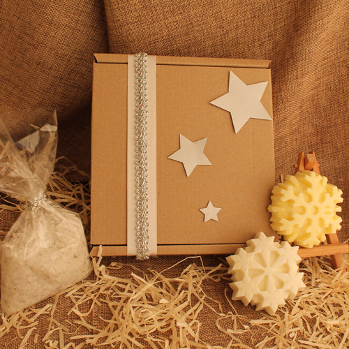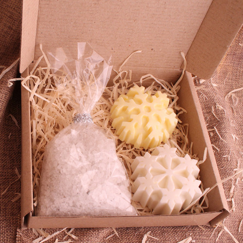 Подарочный набор натурального мыла ручной работы – 2 мыла по 50 г (две снежинки) и морская соль для ванн 200 г, в подарочной упаковке. Мыло изготовлено из натуральной основы белого цвета с добавлением эфирных масел хвои, эвкалипта, апельсина. Каждая фигурка из мыла герметично упакована в защитную пленку. Перед использованием мыла ручной работы необходимо снять пленку.