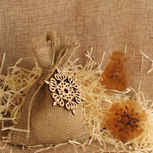 Новогодний набор мыла ручной работы состоит из двух фигурок - снежинки и снеговика, весом по 50 г, в подарочном мешочеке из натуральной мешковины. Мешочек декорирован снежинкой высеченой лазером из фанеры. Мыло изготовлено из натуральной полупрозрачной основы, без применения красителей, с добавлением натурального молотого кофе, эфирного масла хвои и эвкалипта. Каждая фигурка из мыла герметично упакована в защитную пленку. Перед использованием мыла ручной работы необходимо снять пленку.
