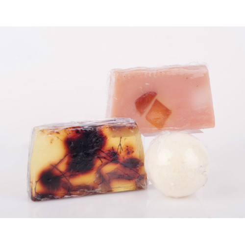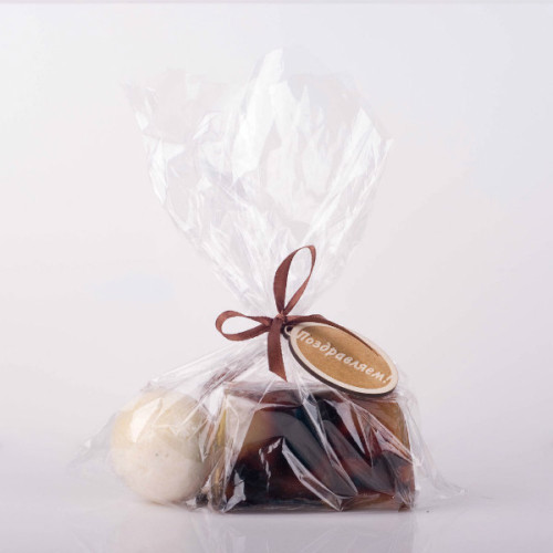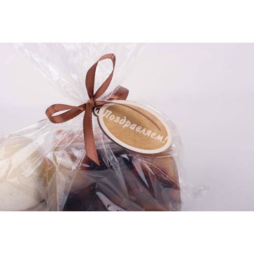 Упаковка подарочного набора украшена атласной лентой и деревянной биркой с нанесенной гравировкой.