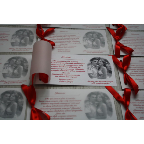 Цветовую гамму лент и элементов приглашения можно выбрать самостоятельно и согласовать с менеджером при заказе.