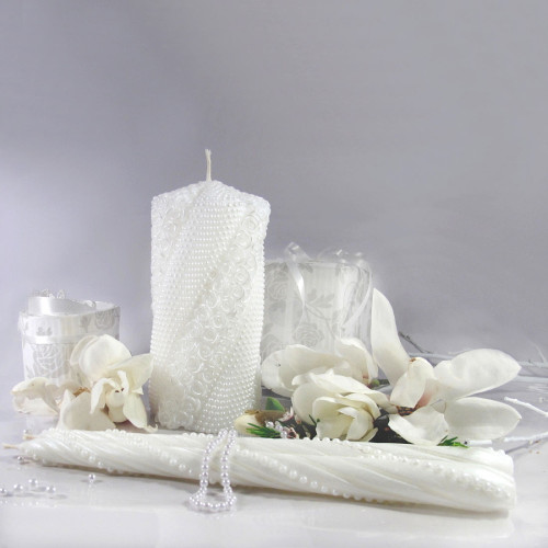 Набор свадебных свечей ручной работы для обряда "Семейный Очаг". Набор "Жемчужная волна" выполнен в белом цвете и украшен жемчугом. Высота свечей - 140 мм и две по 240 мм. Диаметр 70 мм и 2 по 20 мм.