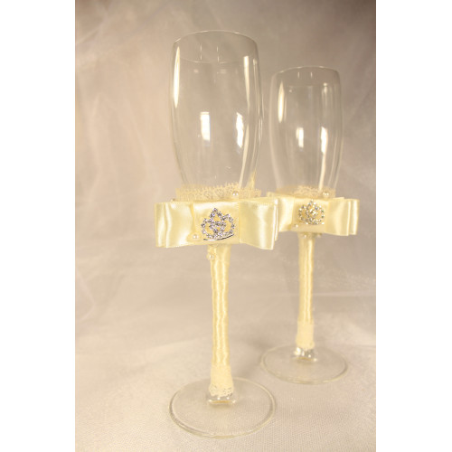 Описание ксклюзивные бокалы для новобрачных. Основа - бокал стекло, украшение - шелковые ленты, кружево, стразы.