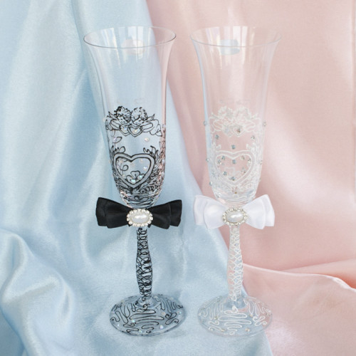 "Ангелы" - нежные свадебные бокалы с изображениями ангелочков. Роспись витражными контурами, атласная лента, стразы.