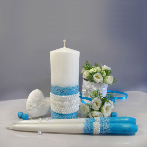 Набор свадебных свечей ручной работы для обряда "Семейный Очаг". Набор выполнен в белом и нежно-голубом цвете с легким перламутровым блеском. Свечи украшены жемчугом и кружевом. Высота свечей - 150 мм и две по 245 мм. Диаметр 60 мм и 2 по 20 мм.