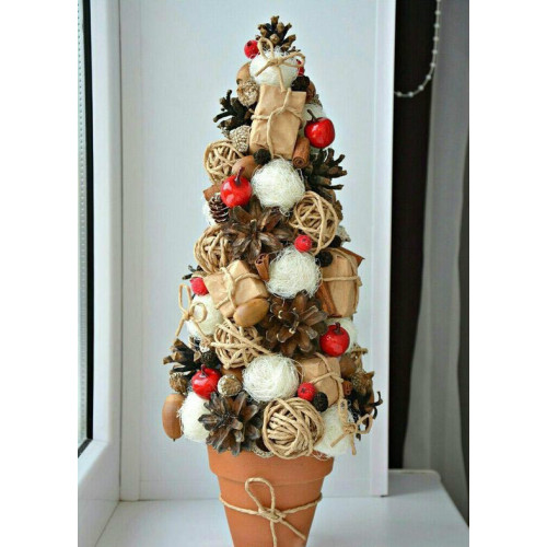 Елка в горшке из натуральных материалов отличное украшение помещений к новогодним и рождественским праздникам.